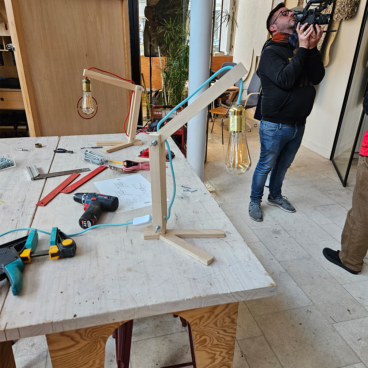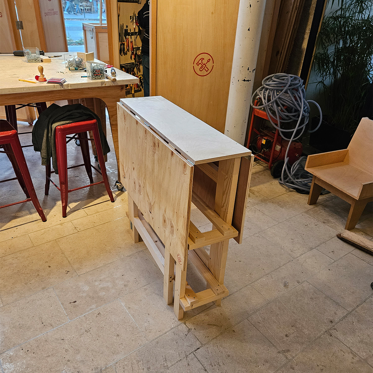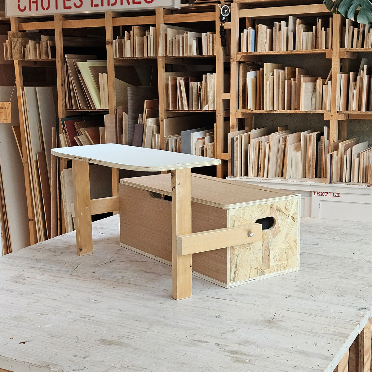 En tant qu’encadrant, j’accompagne les participants dans le dessin, le choix des bois, l’utilisation des machines et l’assemblage sur le temps d’un atelier. Nous les sensibilisons également au réemploi du bois