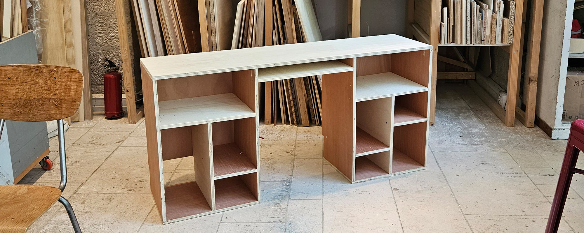 Ma formation de designer d’espace, et mon expérience de scénographe/designer chez Premices and co me permettent de conseiller et de suivre la fabrication des mobiliers réalisés.