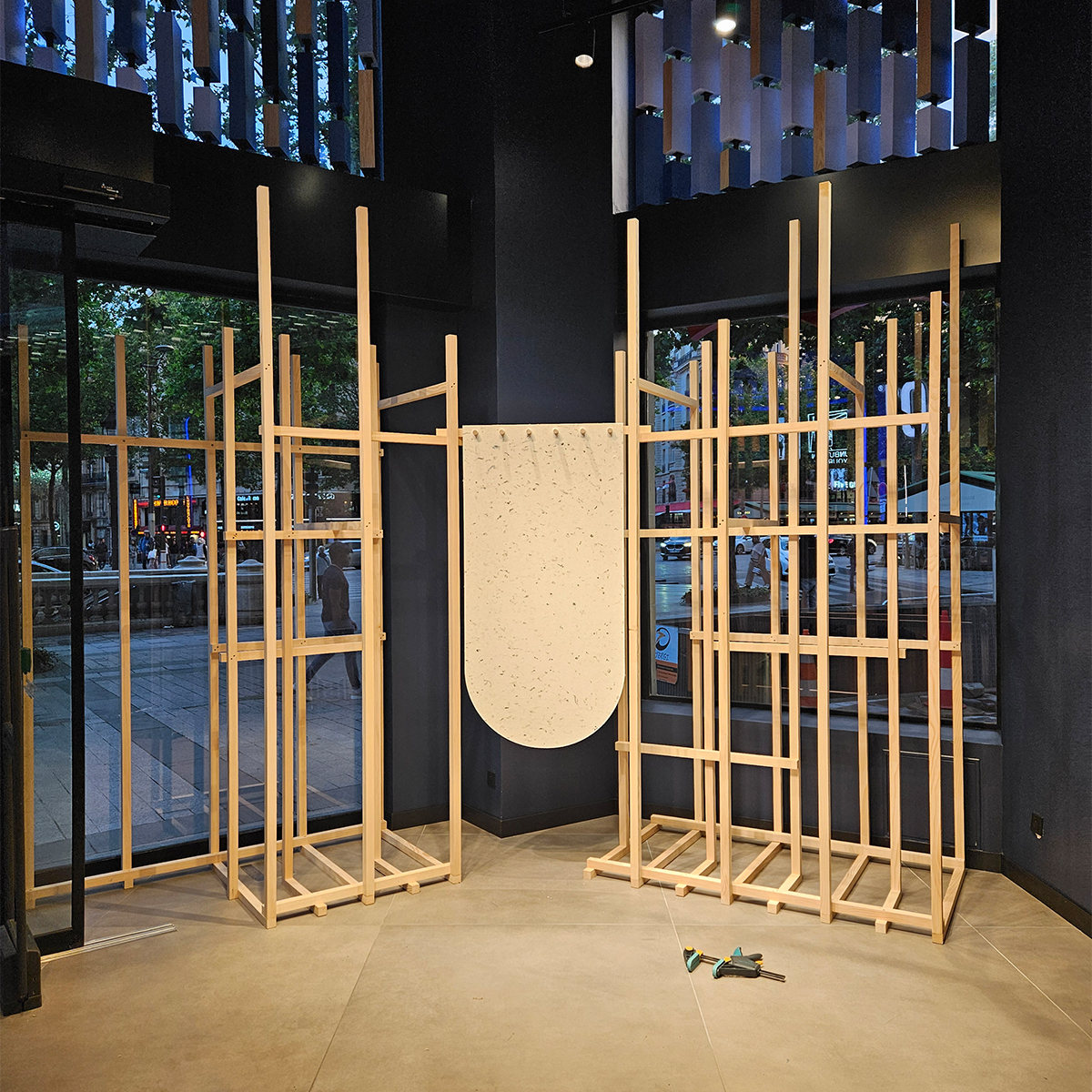Je suis intervenu dans la phase production de ce projet, chez Premices and co. J’ai traduit les intentions scénographiques en volume, en réalisant les plans d’exécution, en gérant la fournitures des matières premières et la fabrication.