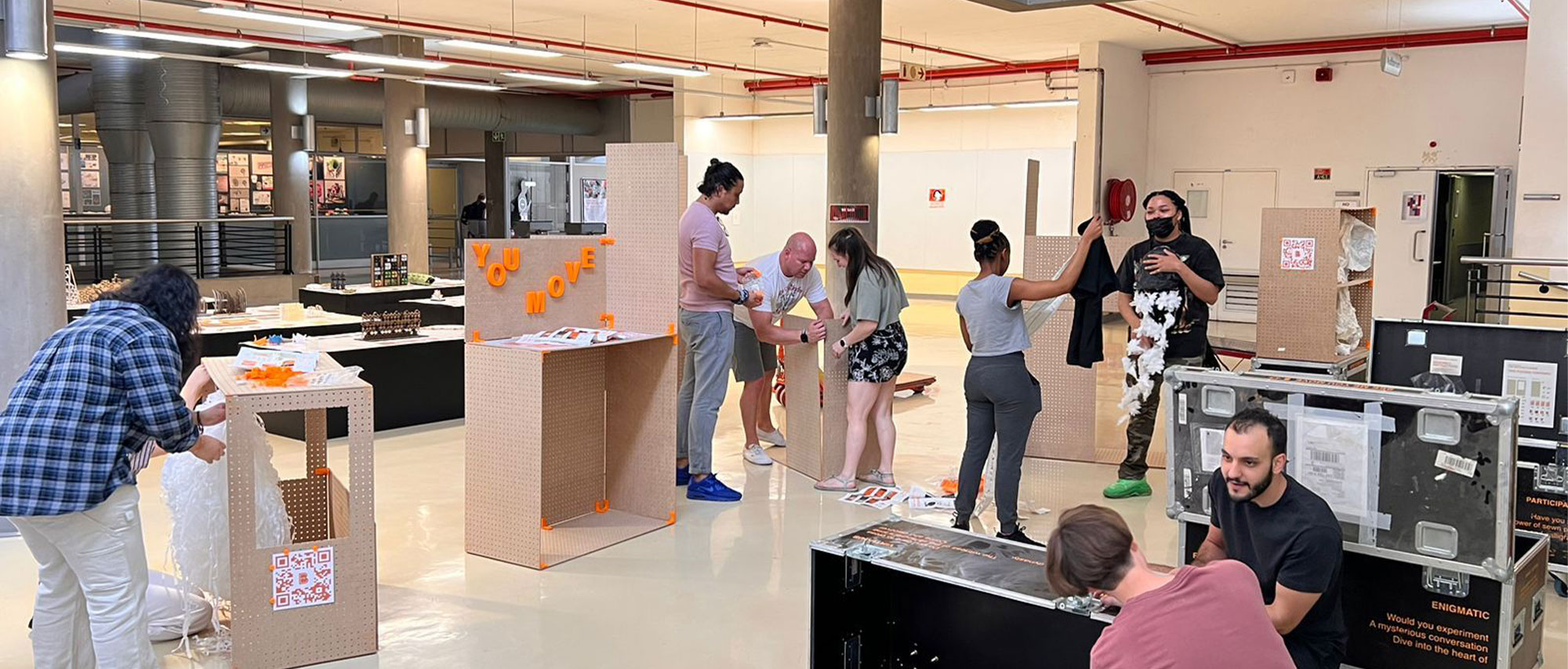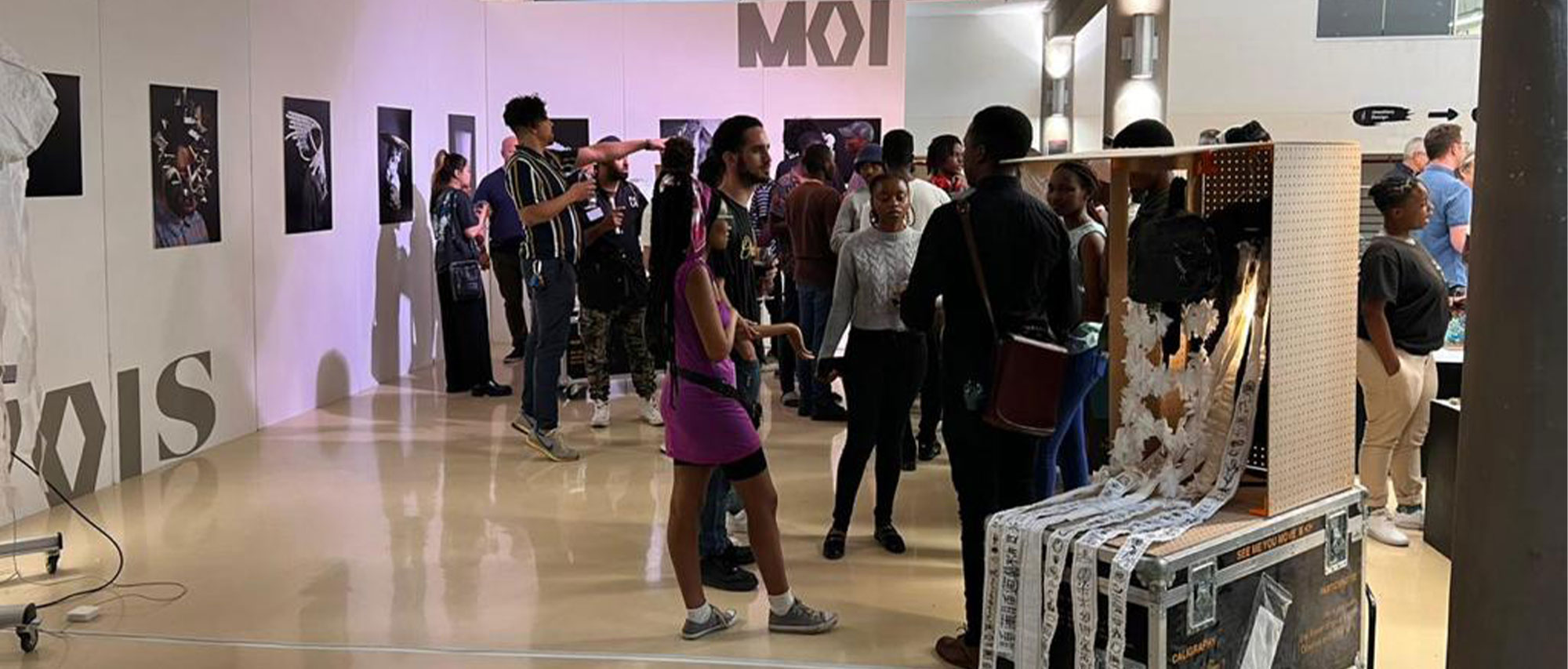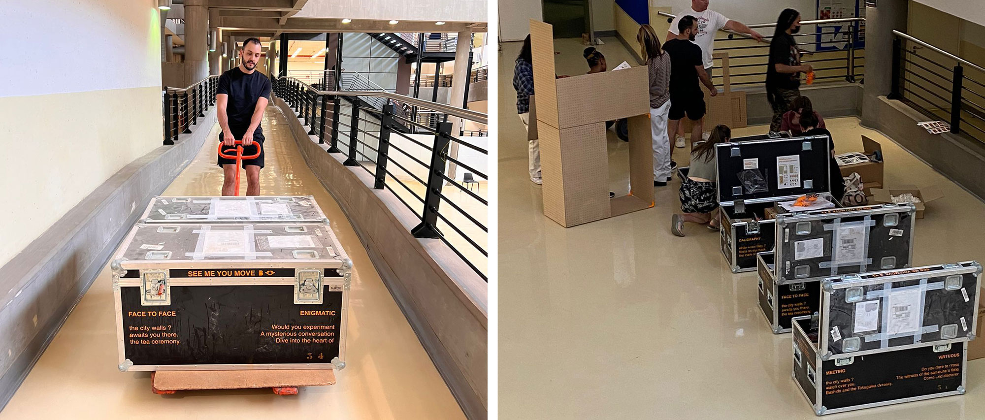 Elle est composée de 4 flycases de 100x50x50cm qui sont envoyés en Afrique du Sud. Elles contiennent l’ensemble de la scénographie. De chacune de ces flycases se déploie une structure modulaire qui accueille un masque. La flycase sert de socle à la structure modulaire et la rend mobile. La mobilité des flycases permet d’assembler les structures (fixées au dessus) et les réçits (graphés sur les cotés) dans l’atrium de l’université de Johannesburg. À travers un set de planches identiques et un kit de montage, la structure peut être montée par tout le monde.