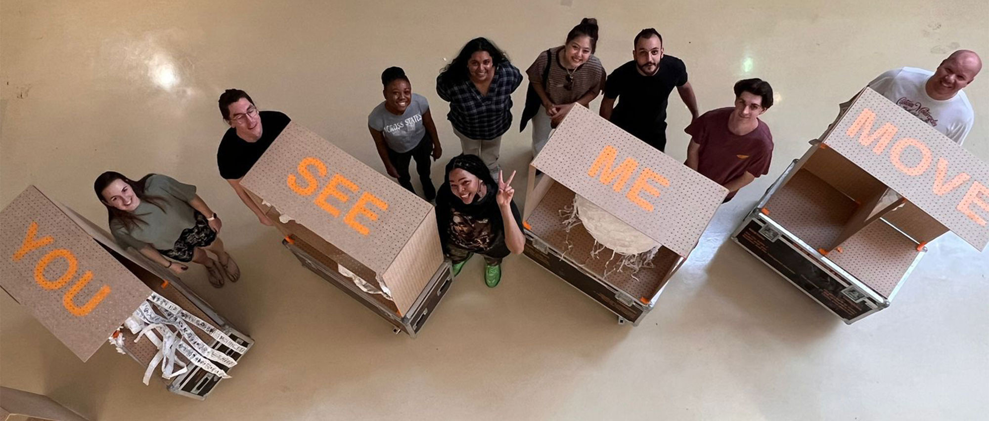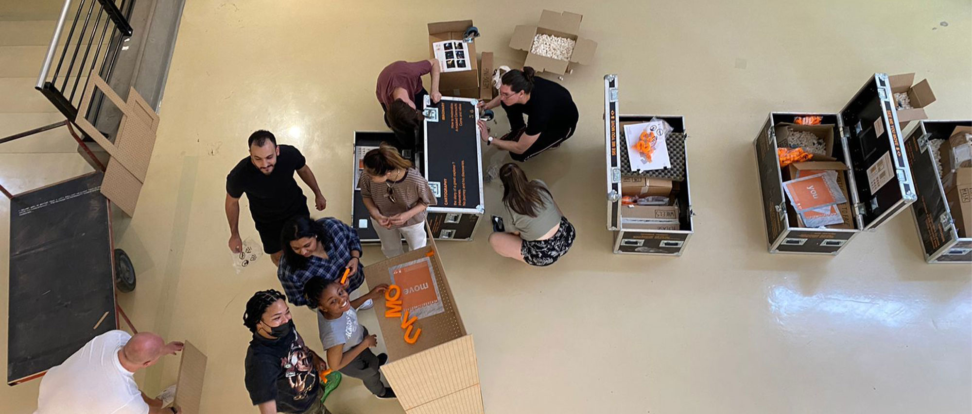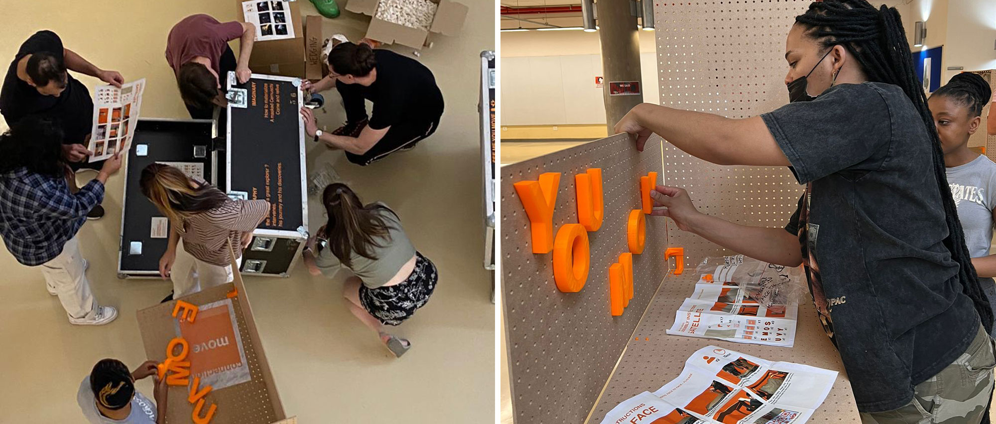 Elle est composée de 4 flycases de 100x50x50cm qui sont envoyés en Afrique du Sud. Elles contiennent l’ensemble de la scénographie. De chacune de ces flycases se déploie une structure modulaire qui accueille un masque. La flycase sert de socle à la structure modulaire et la rend mobile. La mobilité des flycases permet d’assembler les structures (fixées au dessus) et les réçits (graphés sur les cotés) dans l’atrium de l’université de Johannesburg. À travers un set de planches identiques et un kit de montage, la structure peut être montée par tout le monde.